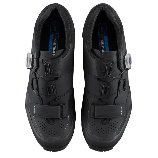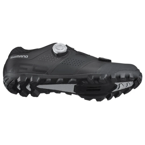 Les chaussures Shimano ME5 (SH-ME 502) sont des chaussures de Trail alliant une puissance exceptionnelle lors du pédalage à une sensation stable en dehors du vélo. La languette décalée et la position du BOA améliorent le confort et offrent des performances de pédalage stables. Le BOA L6 avec une protection en plastique empêche la libération accidentelle lors d’un chox avec des pierres ou autres obstacles que l’on peut rencontrer en tout-terrain. L’armature renforcée assure une grande protection et une meilleure résistance. La semelle extérieure adhérente, en caoutchouc, offre une meilleure traction, même par temps humide. La semelle intermédiaire flexible « Torbal » procure un mouvement fluide au cycliste dans les descentes.