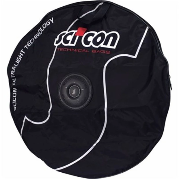 La housse pour roue simple Scicon peut accueillir une roue et est fabriquée en nylon robuste. Elle comporte des protections de moyeu rigides cousues à l’extérieur pour un renforcement supplémentaire.