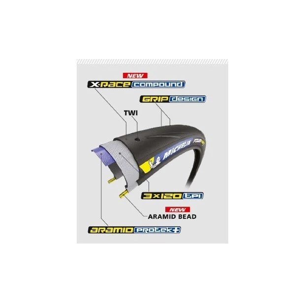 Le pneu Michelin Power Road a été conçu pour l’entraînement et/ou la compétition des cyclistes exigeants. Optimisé pour la compétition, son mélange de gommes de dernière génération, X-Race Compound, allie adhérence sur sol sec comme mouillé, et rendement. Grâce à une bande de roulement lamellisée sur l’épaule et un mélange de gommes à base de silice, le Power Road bénéficie d’une excellente adhérence latérale, notamment en conditions humides. Le cycliste est ainsi plus en sécurité pour aborder les virages à une plus grande vitesse.