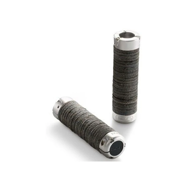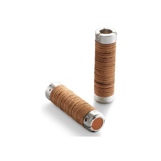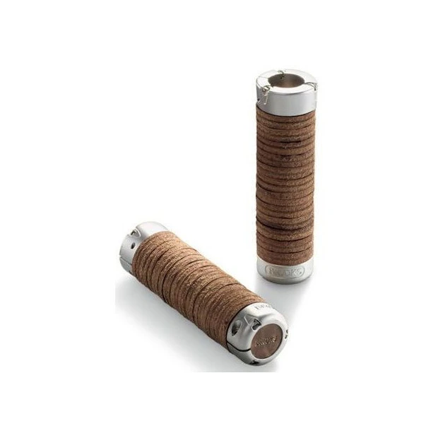 Les poignées Brooks Plump sont fabriquées à partir des mêmes peaux de haute qualité utilisées pour les selles. Des rondelles de cuir sont découpées dans les chutes, empilées et reliées par des rayons en inox. Ces caractéristiques rendent les poignées résistantes, solides et durables. Les rayons permettent un réglage de la longueur des poignées. La longueur standard est 130 mm, mais ces poignées peuvent être raccourcies selon vos besoins. Des poignées de 80 mm sont notamment utiles pour un vélo équipé d’un changement de vitesses de type « poignée tournante ».
