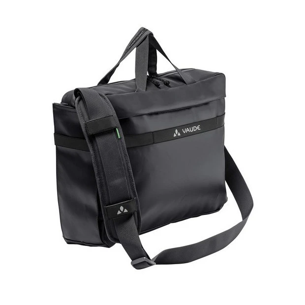 La Sacoche Vaude Mineo Commuter 17, ce sac de vélo de bureau convertible se monte et se démonte en un geste sur le porte-bagages à l’aide d’un rail Plug and Ride. Elle convient donc parfaitement au vélotaf quotidien. Le compartimentage de la Sacoche Mineo Commuter Briefcase 17 est également bien conçu : un mobile et d’autres affaires trouvent place dans le compartiment zippé arrière, le compartiment avant peut accueillir un journal, un bloc-notes et un snack tandis que le grand compartiment principal zippé permet de loger aisément un ordinateur portable 15,6″, des documents, et même un classeur complet. Un porte-bouteilles intérieur maintient fermement une boisson en place et d’autres éléments comme un porte-crayons et un porte-clés assurent une bonne organisation.